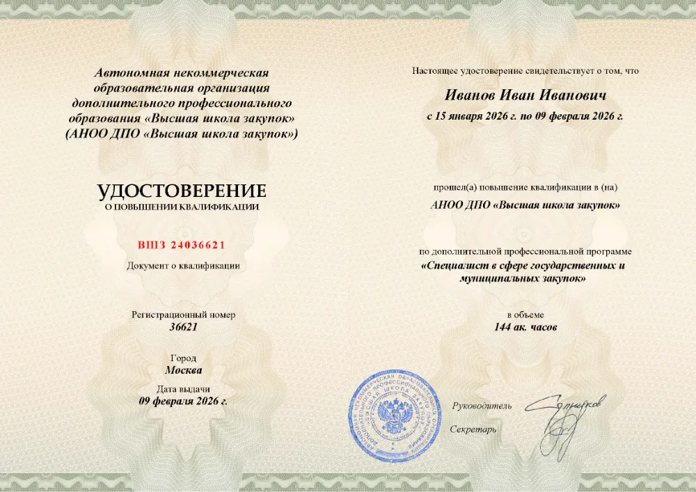 Вы получаете официальный документ о повышении квалификации. Высшая школа закупок (fz44.org) в обязательном порядке вносит сведения об обучении в Краснодаре в федеральный реестр ФИС ФРДО, подтверждая легитимность вашей подготовки перед контролерами.